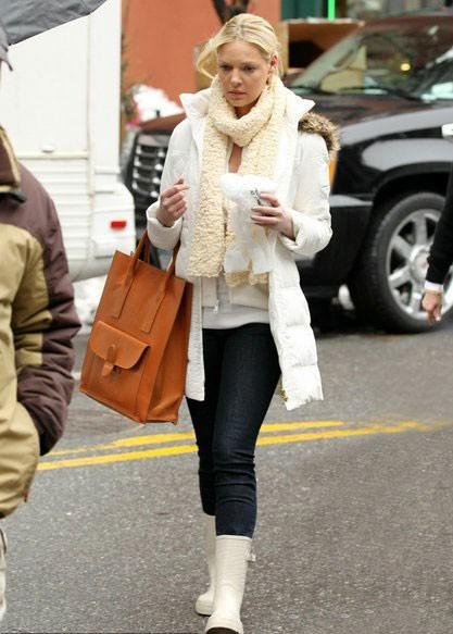 白色羽绒服,白色围巾,白色高靴以及白色毛衣,寒冷的冬天里这样装扮自己一定会给大家耳目一新的感觉,尽显甜美女人味儿。