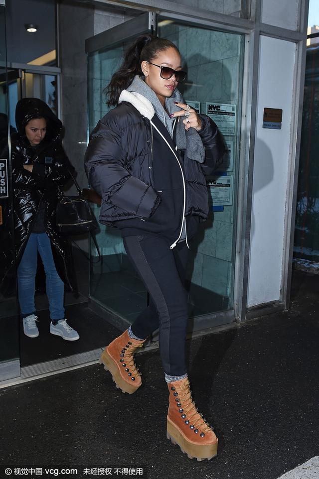 蕾哈娜(Rihanna)外出脚踩的这双驼色麂皮厚底鞋,额额……太抢镜。不过说实话,这么厚的鞋底有点浮夸,不过放在日日身上一切就顺理成章了许多。日常搭配如果姑娘们也想学起的话,推荐不那么浮夸的Underground家的厚底鞋,黑色短款羽绒服+内搭连帽卫衣,这样就ok了。