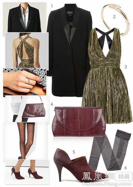 不想在年底节日上被忽视,就需要一件亮晶晶的金色小洋装,在暖烘烘的室内尽情展示你的皮肤。搭配一件收腰黑色大衣,穿一双当季流行的酒红色高跟鞋,再拿一个野性的爬行动物皮包,整个造型份量十足。