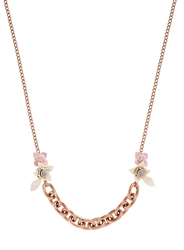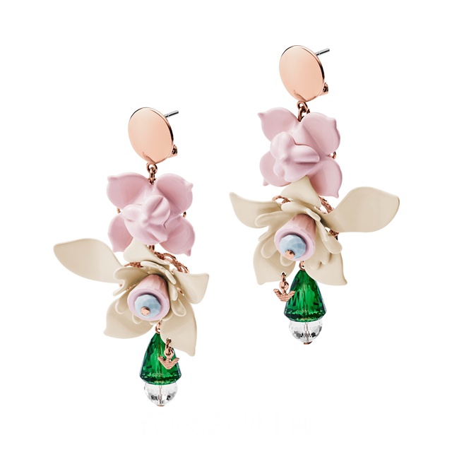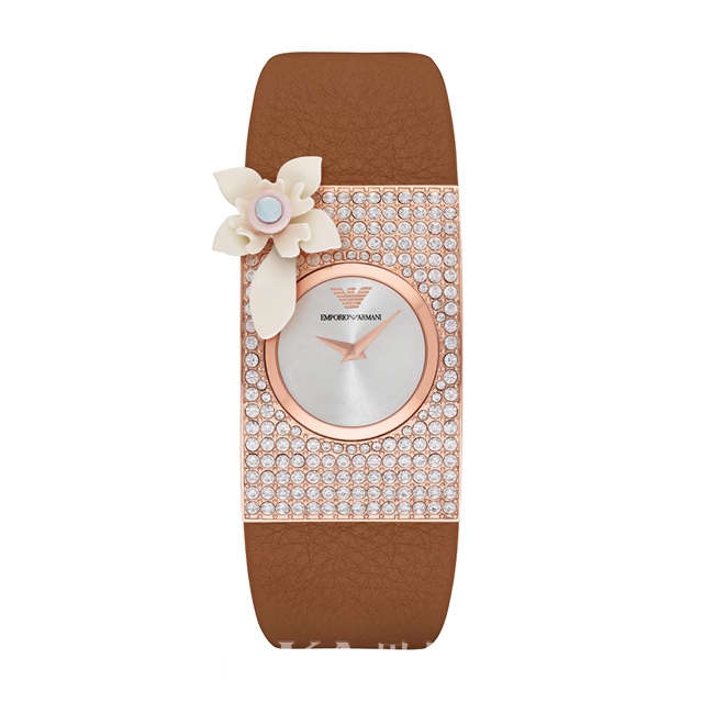 本季女士饰品系列从Giorgio Armani 2016春夏走秀中汲取灵感,精心搭配粉色及白色珐琅花朵,并嵌以水晶作为点缀,别致的玫瑰金色设计凸显端庄典雅的女性气质。该系列女士腕表以相同的花朵造型成为设计亮点,与饰品相映成趣。