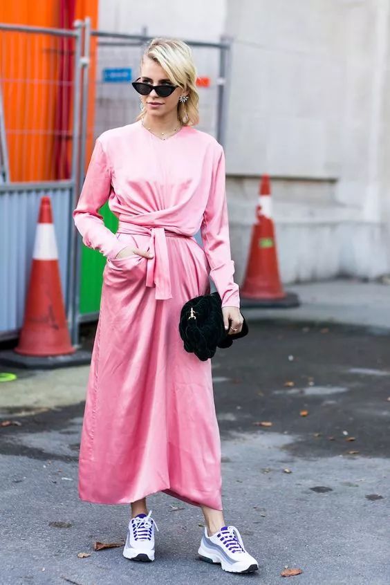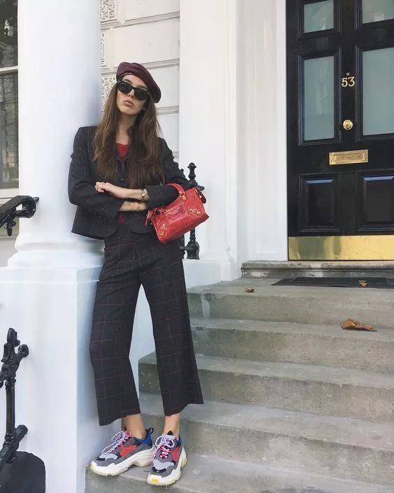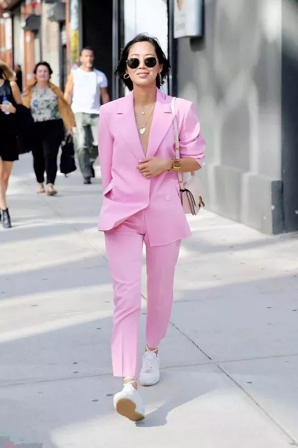 穿娇艳色系的西装套装搭配小白鞋也有很加分