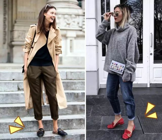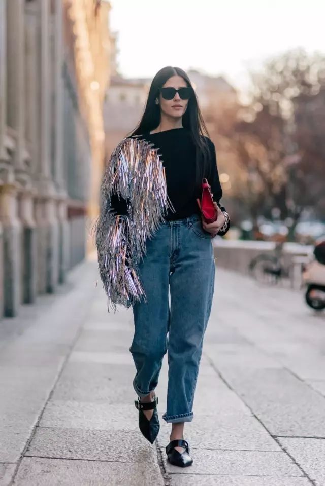 将宽松的牛仔裤卷边穿搭配深V鞋平底鞋