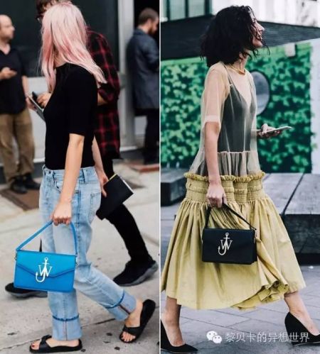 时装周上看到不少人提着JW字母的包包,这不是设计师J.W. Anderson品牌的标志吗,这款包倒是简简单单,唯一让人印象的是包包上的LOGO,但也太抢镜了。▼