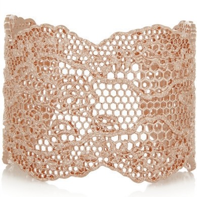 Aurélie Bidermann 与巴黎最顶尖的珠宝工匠和镀金工人合作,手工打造其个性设计。这款结实的镀玫瑰金黄铜手镯便被制作成复古蕾丝造型,可紧贴手腕佩戴。