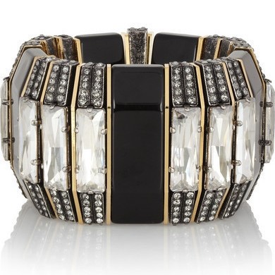 Lanvin 这款颇具分量的黑色树脂和金色黄铜手镯配有白镴底托,其中镶嵌有长方形切割密镶施华洛世奇水晶和水晶玻璃。隐形松紧带确保其可舒适地佩戴在腕间。