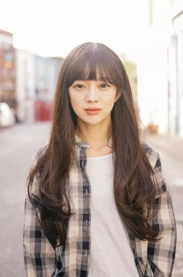 中长的直发,外翻的刘海,配上棕色的发色,整个造型看起来个性又优雅,也有层次感。