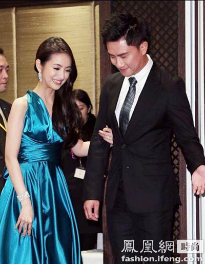 一身宝蓝色长裙的衬托下,林依晨的身形更加袖长优雅,无刘海长发的她将发丝全部偏至一侧,头发微卷,体现出了她细致的优雅美态。