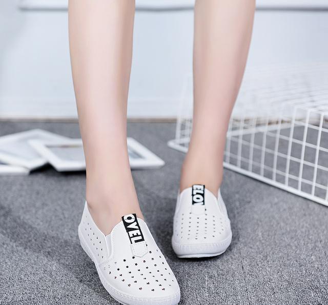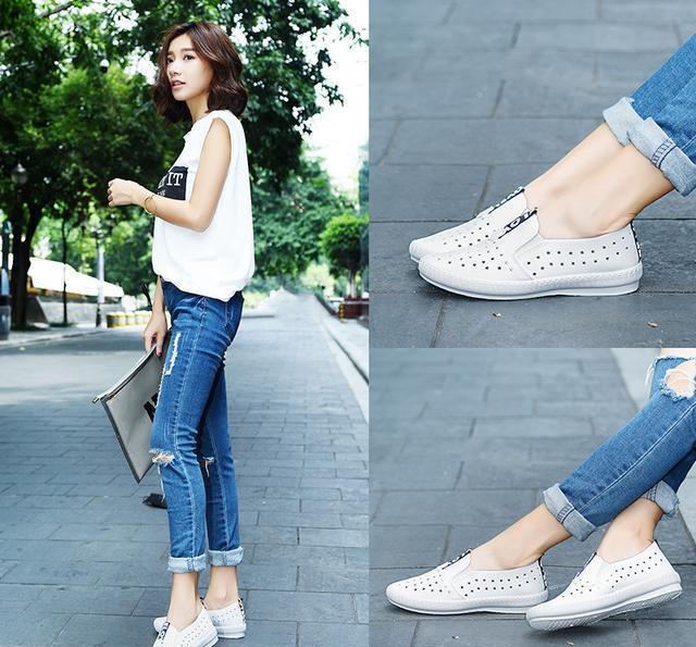 韩范十足的小白鞋,能够任意搭配夏天的服饰,秀气的鞋型,精致的做工,以镂空小孔和字母印花点缀在鞋面,增添整体时尚感和透气性,非常贴心。