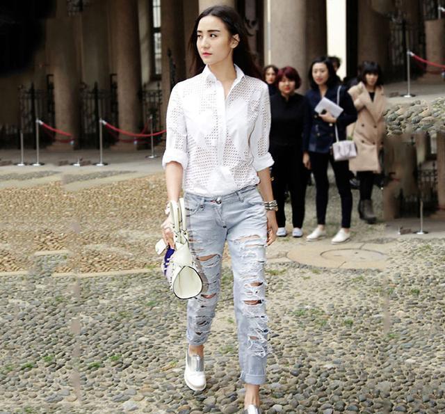 一身气质的白衬衣+洋气破洞牛仔裤,配上脚上的时尚拼色小白鞋,整体清新优雅,随性又很时髦,特别抢眼。鞋子采用优质牛皮制作,细腻有光泽,而透气内里和柔软鞋底的设计,又能增添舒适排汗的效果。
