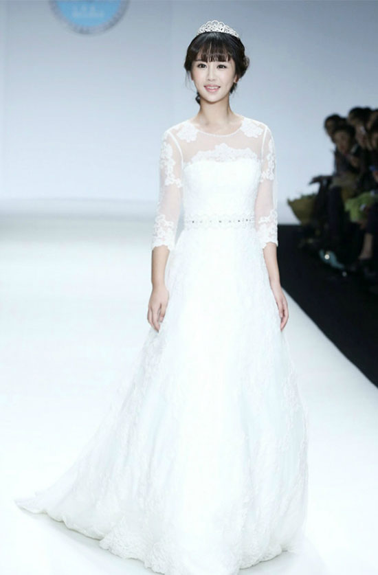 台湾女星陈乔恩身穿白色婚纱走秀,戴皇冠扮白雪公主。