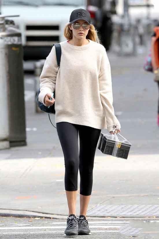 当然,你还可以像Gigi这样配紧身运动裤,即使刚从健身房出来也要秒杀路人一个世纪。