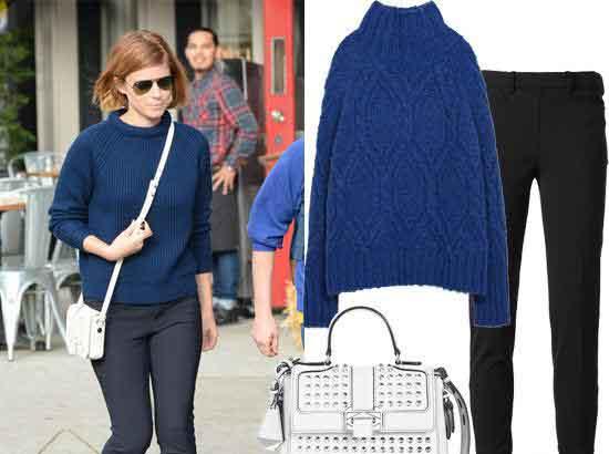 如果实在怕冷,像Kate Mara这样一件藏蓝色高领针织配合简单的黑色牛仔裤,只要气场足,怎样都能秒变女一号!