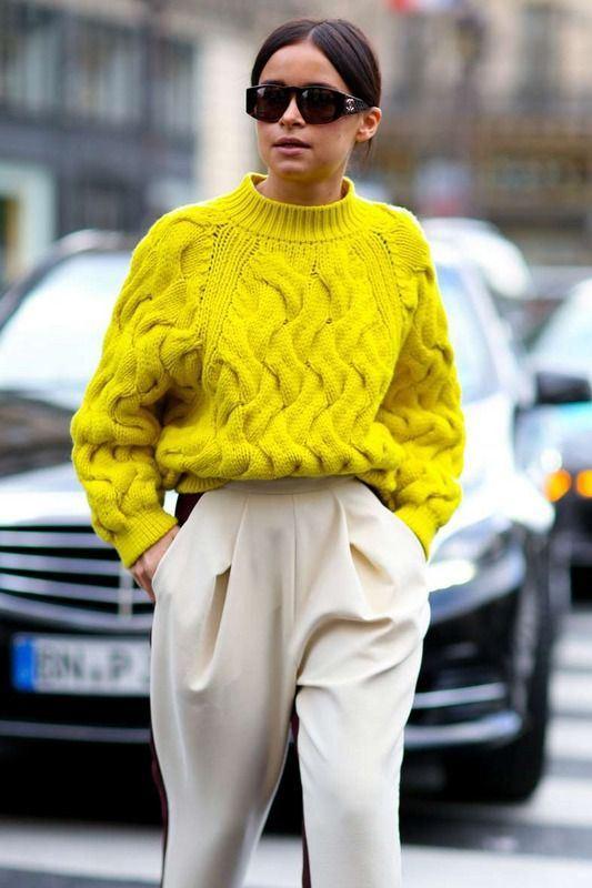 俄罗斯名媛Duma这种半高领的绞花毛衣最近特别流行,尤其是明亮的鹅黄色干净又时髦,在满地黑白灰的冬天绝对是吸睛利器。