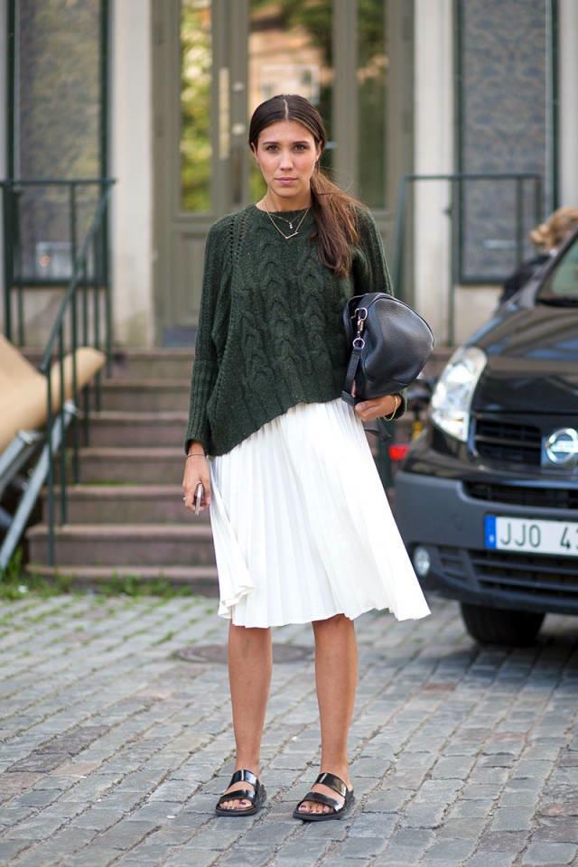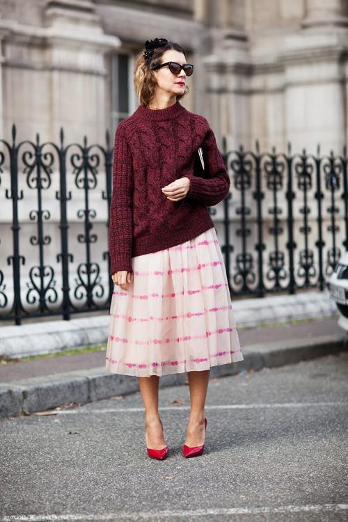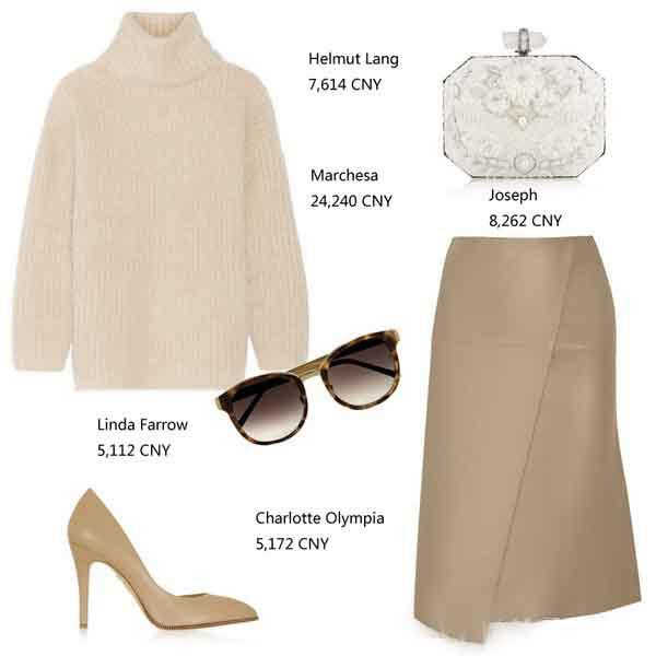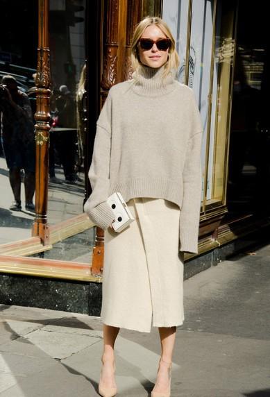 同样的Helmut Lang家针织纯色毛衣却被时尚博主Pernille Teisbaek用来搭配裸色系的裙子,配以同色系高跟尖头鞋,优雅大方。尤其一个精致的小手包与之搭配,看起来优雅十足!