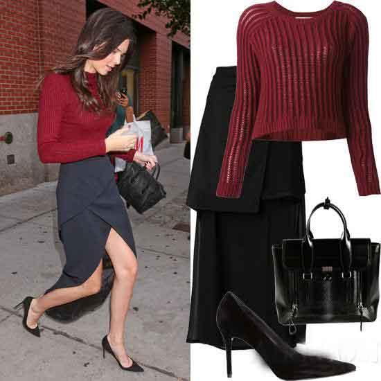 或者如果你足够抗冻,像金小妹这样酒红色超短毛衣配合高腰不规则拼接长裙,同样是吸睛达人。