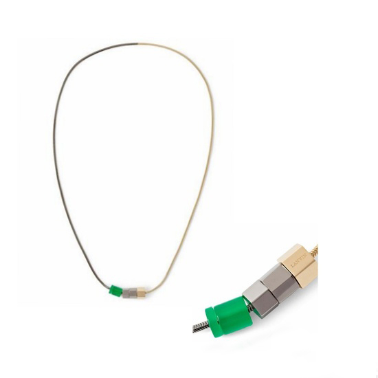 Lanvin金属项链 约人民币¥3,061。明亮的翡翠绿让简单的配饰在造型中脱颖而出,金属色的螺栓和蛇形链平衡翡翠绿的柔和,使整体更有男人味儿。