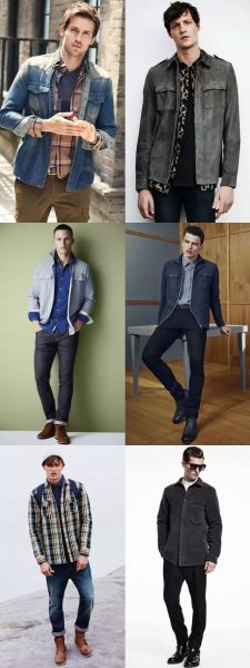非常休闲的一种搭配方式,这种搭配方式要注意两点,第一点,衬衣一定不要系扣子,款式上要选择宽松款式,格纹和迷彩都是值得推荐的,第二点是,外面的夹克不管是皮的还是棒球夹克都一点要选择短款的修身款式,不要偏大。