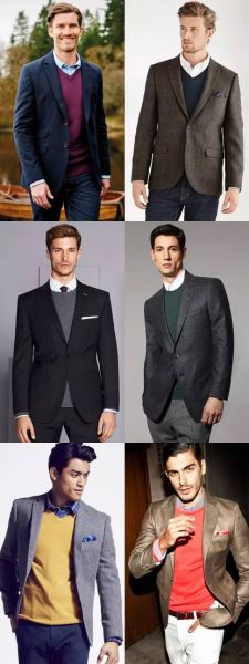 这是一种非常非常经典的穿法,秋冬很实用,适合沉稳的商务男士。在里面针织套衫的选择上,一般分为圆领和鸡心领,圆领比较年轻一些,鸡心领则比较沉稳。颜色上如果不想局限在无聊的黑灰上,不妨大胆的选择一些亮眼的颜色。