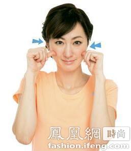 Step 1:从鼻翼两侧开始,沿着颧骨下方的凹陷处,用两个大拇指一直点按到脸颊两旁。让僵硬的面部筋肉放松舒缓,从而拉平法令线褶皱。