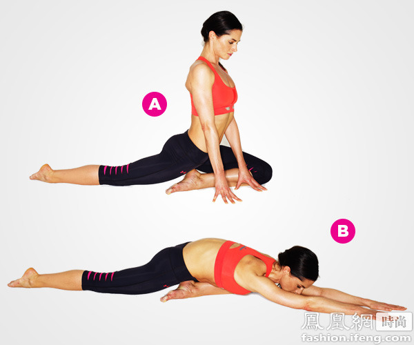 坐在垫子上,曲起左边膝盖,右腿往后延伸,左脚掌碰到右大腿。高坐,吸气(见图A),呼气的同时上半身俯身向下,双手往前延伸,直到左臀有到适当的拉伸感。胸部可以放在左边大腿上。右腿保持挺直(见图B),保持这个姿势5到10个呼吸,然后举起双手,回到初始位置。换曲起右边膝盖,重复该动作。