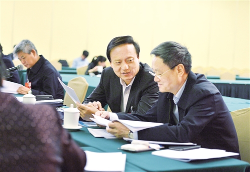 3月15日上午,全国人大代表赵超(左)、熊群力讨论认为,应加快发展“互联网+医疗”,提高医疗服务效率、降低成本。本报记者 李景录摄