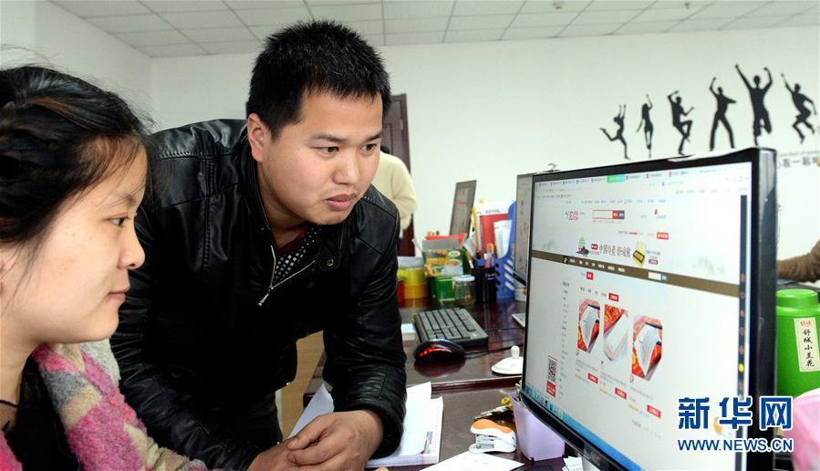 4月6日,孙龙(左二)在查看客户的商品订单。因为“着了魔”似地迷上“淘宝”,孙龙在大二时做出了退学的决定,开始他的创业生涯。2015年底,27岁的孙龙和创业有成的父亲自筹资金在家乡安徽省舒城县开发区建起了“徽网在线电子商务产业园”。2016年春节,他们以“网上认养”的方式销售当地的黑猪肉,短短一周就销售农家黑毛猪肉1.5万多公斤,同时绿皮鸡蛋、舒城小兰花茶叶等农副产品也有不俗的销售业绩,让农户普遍实现了增收。目前已有淘宝、京东等电商的舒城点和40余家电商企业入驻。新华社记者 陶明 摄