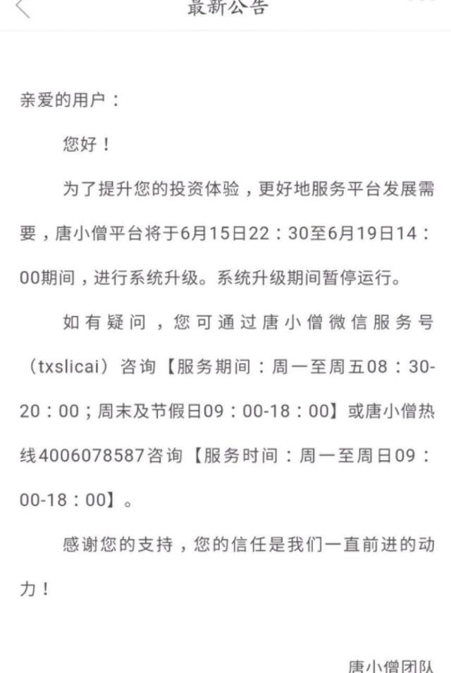 6月16日,据多方消息源传出,上海互金平台“唐小僧跑路”、“母公司被查”,公司法人疑似“自首”,员工“被离职”等多条劲爆消息。几天前,唐小僧理财app上发布一则公告,唐小僧在公告中称将于6月15日22:30至6月19日14:00进行系统升级,系统升级期间暂停运营,当时并没有引起多大的质疑,但仅仅一天之后突然出事,震惊了所有人。