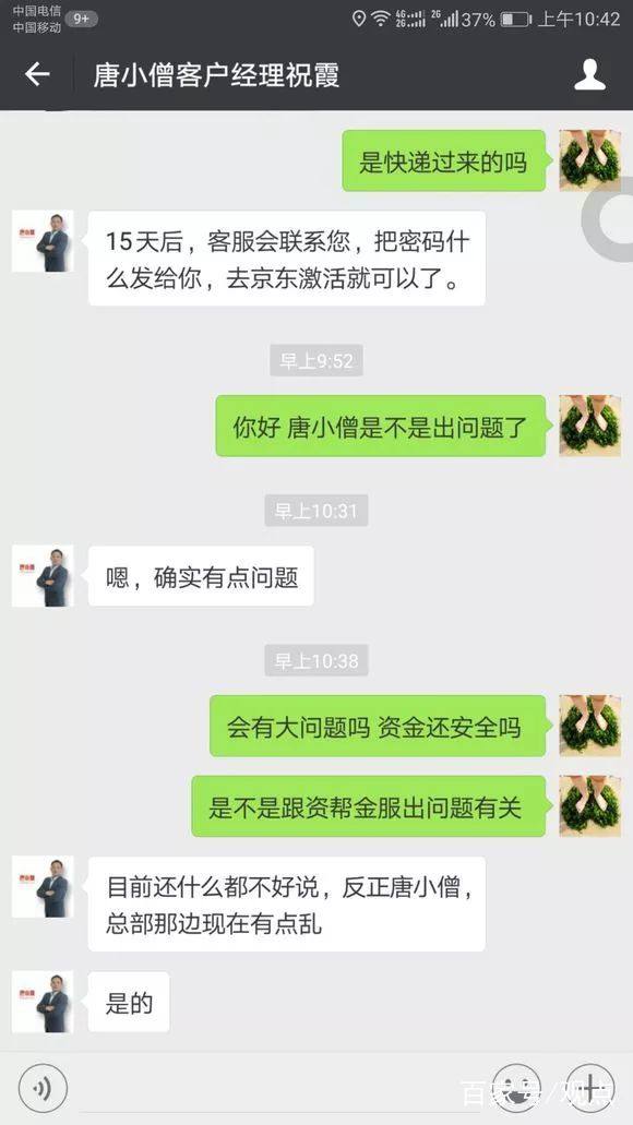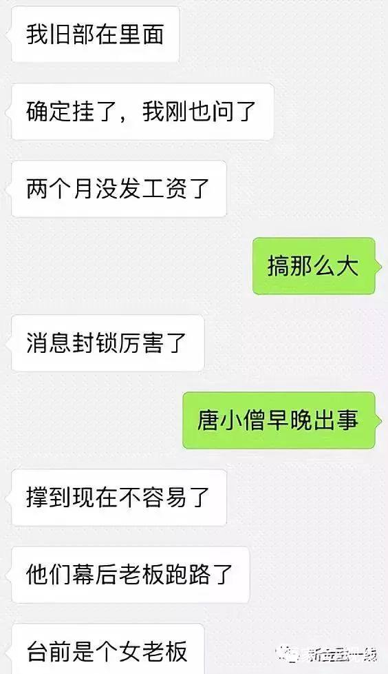 同时,一张名为“唐小僧客户经理祝霞”的微信聊天记录遭到曝光,在该聊天记录中,该名疑似工作人员坦诚承认唐小僧确实有点问题,指出目前总部有点乱。