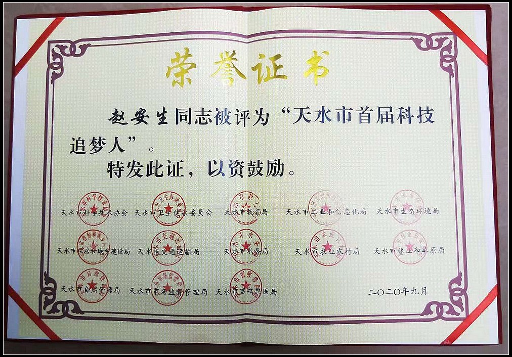 日前,由天水市科学技术协会、天水市卫生健康委员会、天水市教育局、天水市工业和信息化局、天水市生态环境局、天水市住房和城乡建设局、天水市交通运输局、天水市水务局、天水市农业农村局、天水市林业和草原局、天水市自然资源局、天水市市场监督管理局、天水市畜牧兽医局等13个部门联合举办的天水市首届科技追梦人评选结果揭晓,甘肃天之水文化产业开发有限公司董事长赵安生等众多科技、文化、网络大咖名列其中。这些科技领域里的先进典型,贡献突出、事迹感人、展现了新时代的精神风貌,他们用切身行动书写了“科技追梦”,诠释了科技工作者追求真理、勇攀高峰的科学精神。