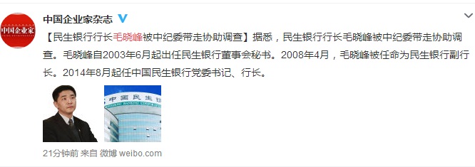 【民生银行[-1.66% 资金 研报]行长毛晓峰被中纪委带走协助调查】据悉,民生银行行长毛晓峰被中纪委带走协助调查。毛晓峰自2003年6月起出任民生银行董事会秘书。2008年4月,毛晓峰被任命为民生银行副行长。2014年8月起任中国民生银行党委书记、行长。(中国企业家杂志)