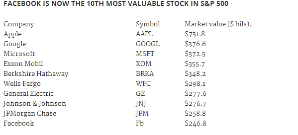 Facebook取代沃尔玛成为标准普尔十大市值最高公司,与苹果、谷歌和微软一起挤压传统企业的位置,象征意义在于美国投资人愈发青睐科技公司。从两家公司的对比看,Facebook去年的收入是125亿美元,而沃尔玛是4760亿美元,Facebook的总收入目前还赶不上沃尔玛的盈利,不过营收的增速是42%,而沃尔玛的营收增幅在下降。Facebook的员工数在上个季度刚过10000人,而沃尔玛全球员工总数为220万人,市值与公司体量上的差异体现出市场更看好Facebook的潜力。在过去一年中,Facebook的股价上涨了30%多,而标准普尔500指数同期只上涨了8.2%,这是因为Facebook每个季度的经营业绩都超出了分析师们的预期。现在分析师GeneMunster将Facebook目标价提高到120美元,比现在的股价还高30%,按照这个价格计算与其他标准普尔市值十强公司目前市值计算,Facebook将会成为市值第六大的公司。