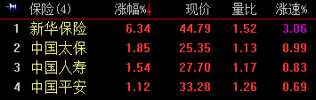 中午收盘,保险涨1.82%。新华保险[3.25% 资金 研报]收盘前直线大涨,午盘阶段涨幅达5%,收盘涨6.34%;中国太保[0.96% 资金 研报]、中国人寿[0.95% 资金 研报]、中国平安[0.18% 资金 研报]涨幅均超1%。