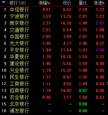 银行收涨1.47%,中信银行[5.55% 资金 研报]、宁波银行[3.98% 资金 研报]、交通银行[0.94%资金 研报]、南京银行[4.89% 资金 研报]领涨,个股全部翻红。