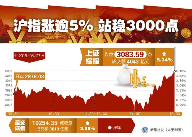 新华网上海8月27日电(记者潘清)在央行“双降”释放宽松信号的基础上,养老金等长期资金入市提速对A股形成鼓舞。27日A股强劲反弹,上证综指站稳3000点整数位,并录得逾5%的年内第三大单日涨幅。