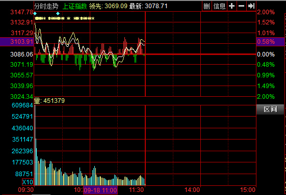 18日沪指分时图 新华网消息 今日早盘两市高开震荡,沪指高开0.46%站上3100点后震荡翻绿,随即震荡走高。截至午盘,沪指报3098.28点,涨0.40%,成交1128.29亿元;深成指报9794.07点,涨0.56%,成交1370