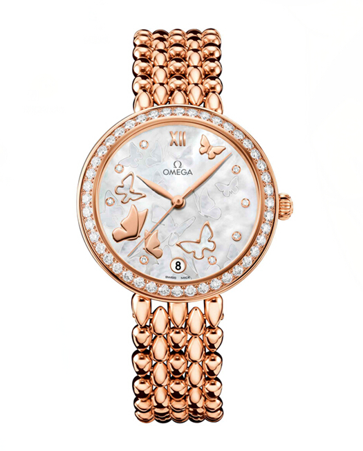 欧米茄闪耀呈现碟飞典雅系列Dewdrop同轴腕表,完美捕捉大自然中灵动蝴蝶的那份神秘而优雅的气质,为碟飞家族再添浪漫的女性韵味。18K红金表壳配以耀目镶钻表圈,两边各有3个”水滴”造型表耳。华美的表盘由18K红金和白色珍珠贝母打造出迷人的蝴蝶图案。此款精美的腕表饰有8颗钻石小时刻度和5节式由颗颗”水滴”串起的表链, 同时搭载欧米茄2500同轴机芯。