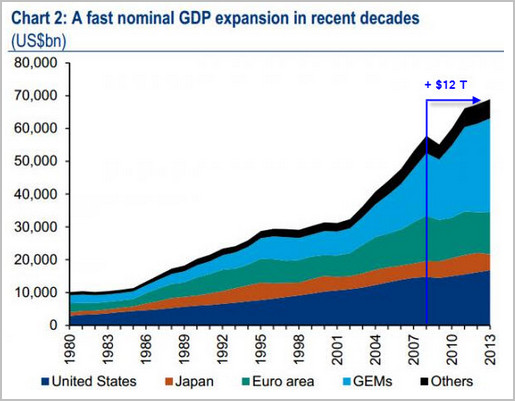 换句话说,全球央行在以名义国内生产总值5倍的增速来发放债务。