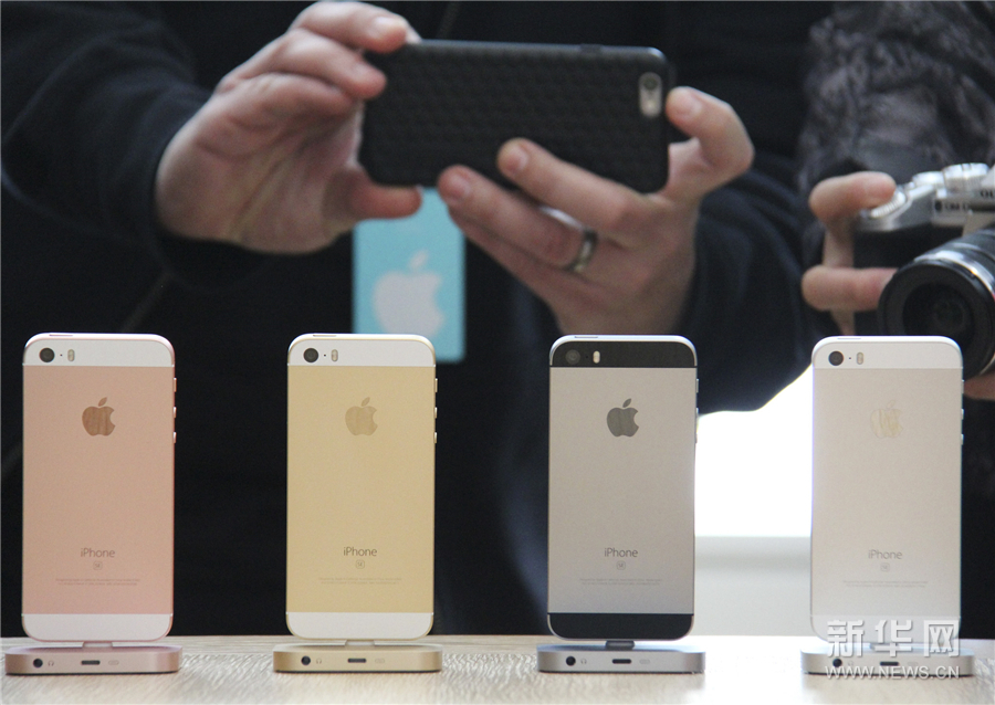 3月21日,在美国加利福尼亚州丘珀蒂诺举行的苹果公司发布会上,参观者拍摄iPhone SE手机。新华社发