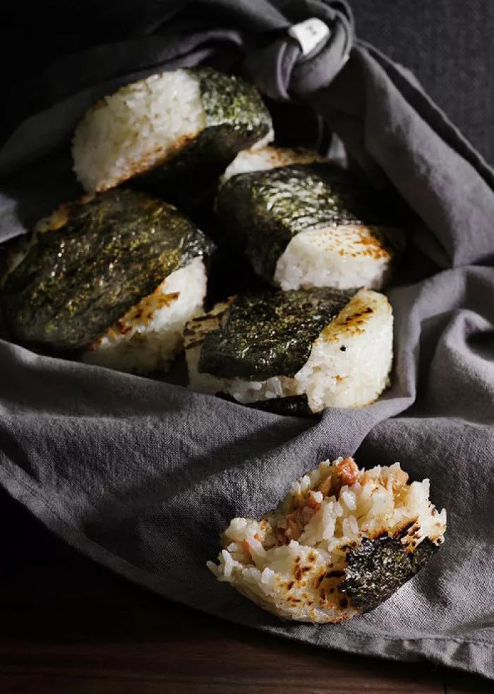 5、在中间放上一颗虾仁。把保鲜膜收圆,留虾尾在外边,捏紧。小心的去掉保鲜膜,一个虾仁饭团就做好了。