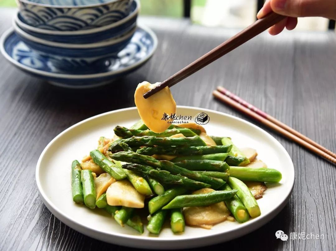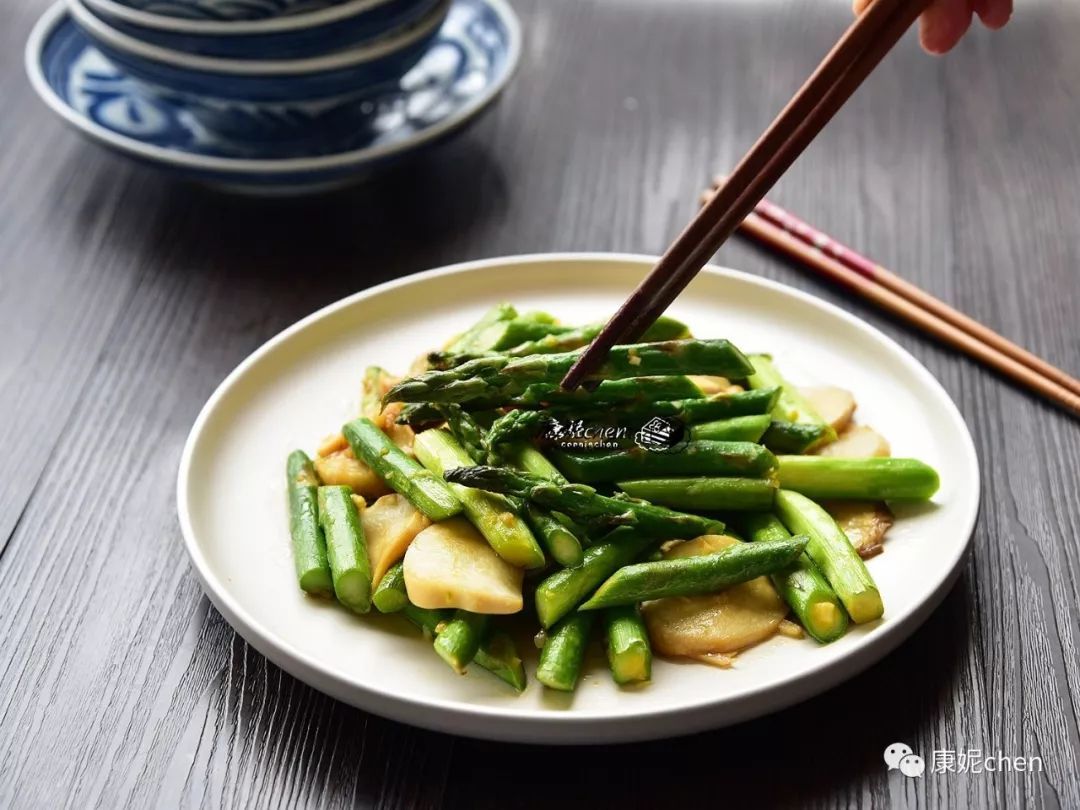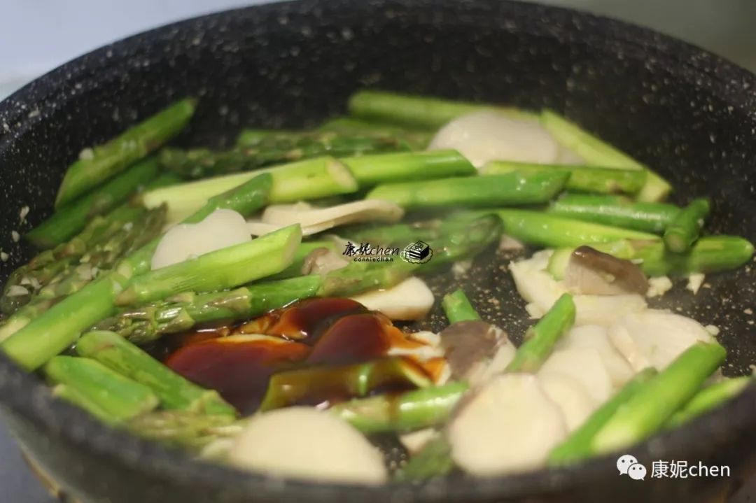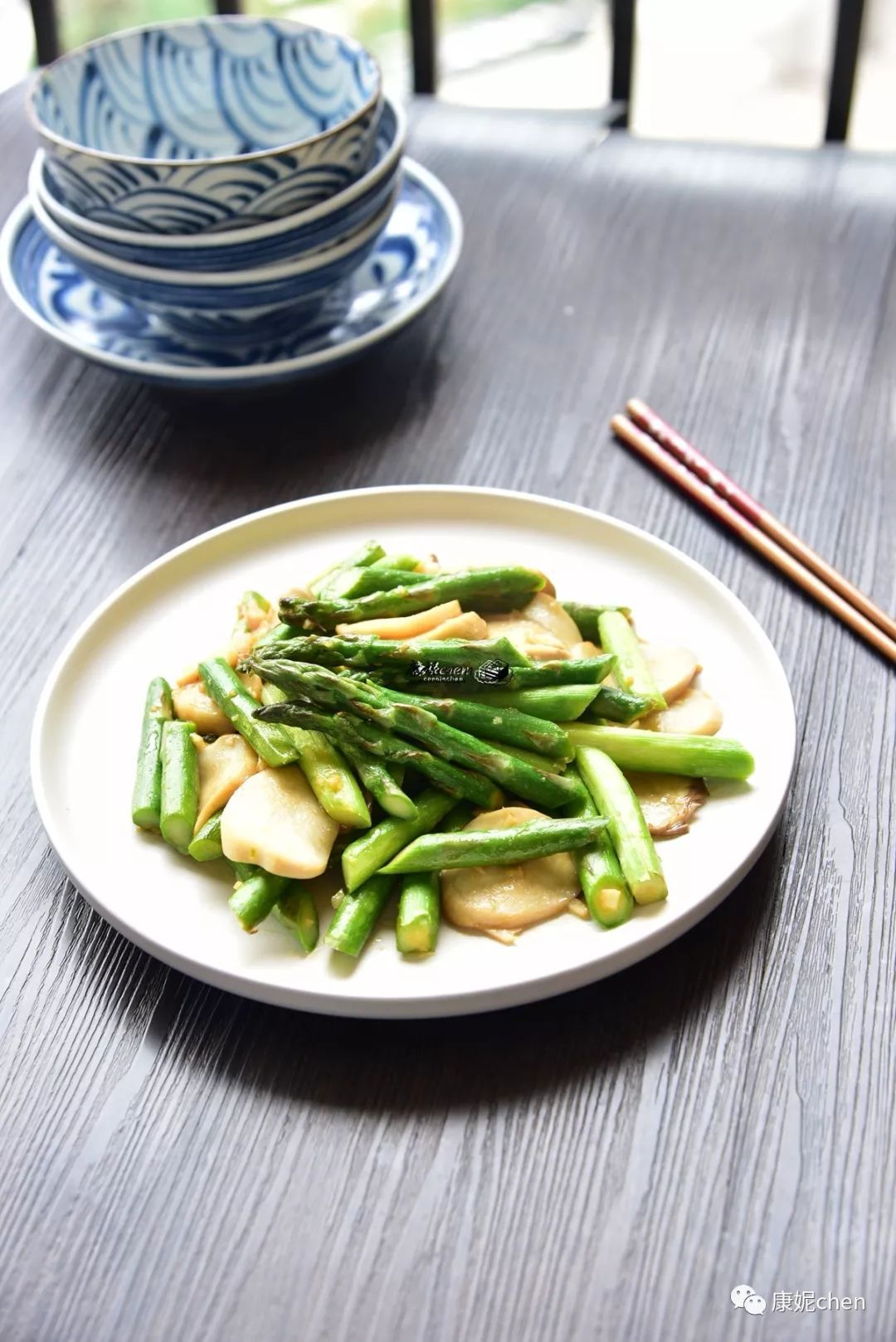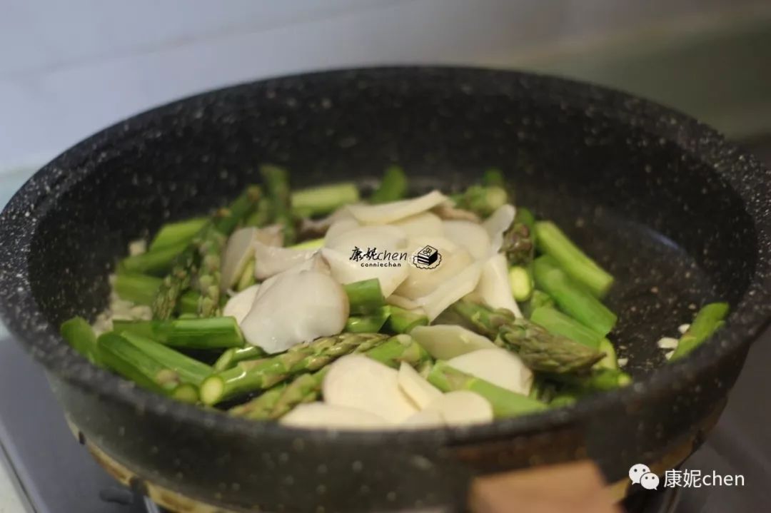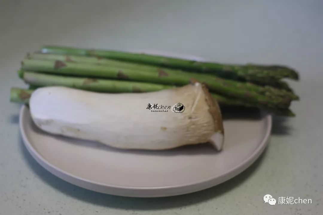 我觉得新鲜又很嫩的芦笋不要过度炒,我的处理方法把杏鲍菇先焯水,那么这两样一起炒,在很短时间内就能炒好。