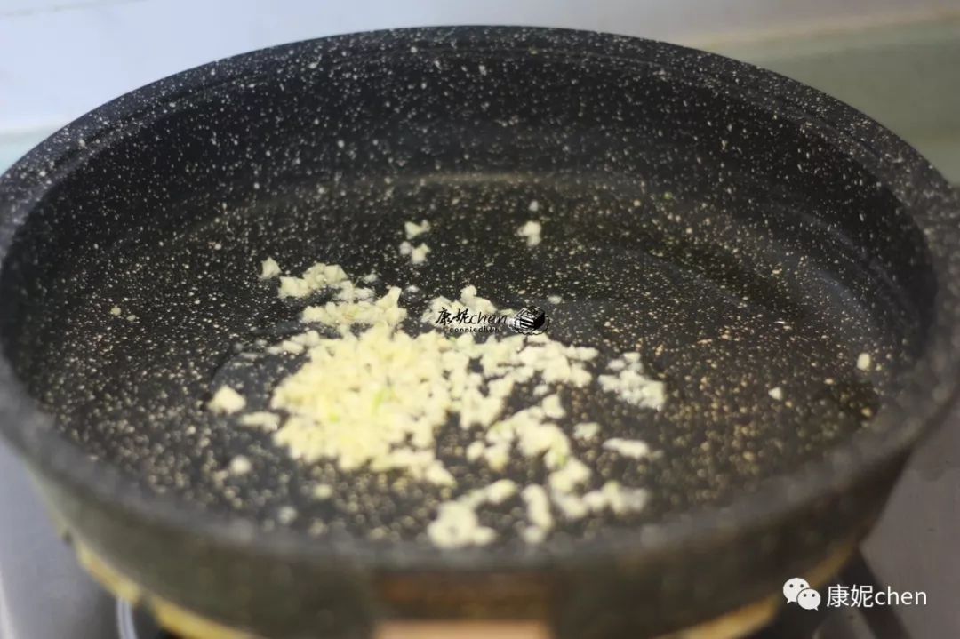 3 平底锅放少许油,爆香蒜蓉,我用平底锅炒菜,可以减少油量,放一丁点油就能炒好