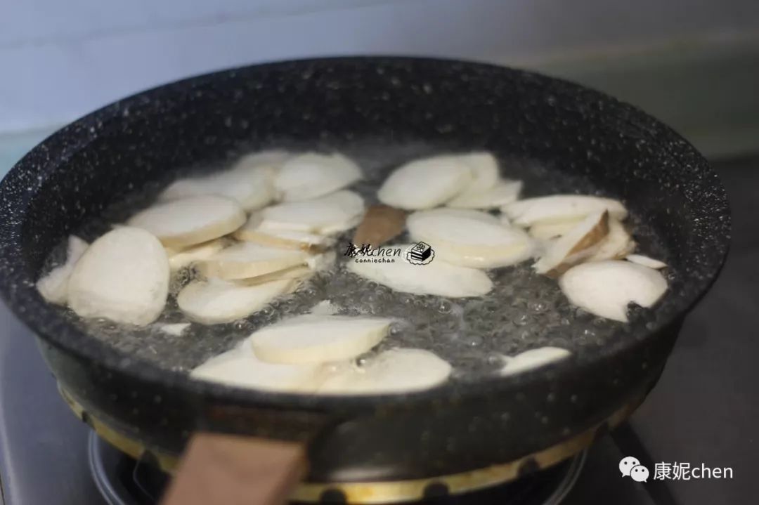 1 把杏鲍菇切片,烧开水后,放入杏鲍菇焯水