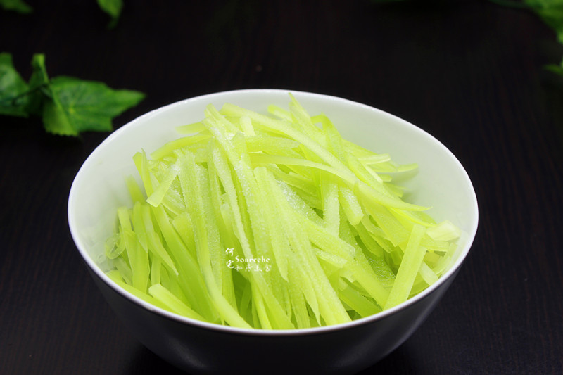 3.切好的莴笋丝,放盐腌制3-5分钟,可以去苦涩,但是不宜太久,这样会影响口感。
