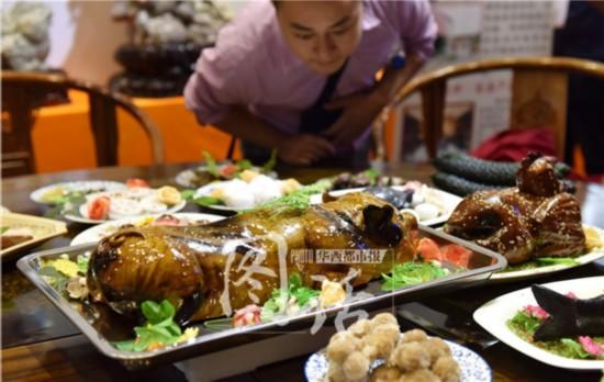 20万元一桌的“满汉全席” 你敢吃吗?(组图)  清蒸鱼、烤乳猪、卤鸡爪、红烧肉、黄瓜、花生、藕……21日,一桌造价20万元的“满汉全席”亮相第四届中国(绵阳)科技城国际科技博览会。不过这桌美味的大餐是吃不动的,