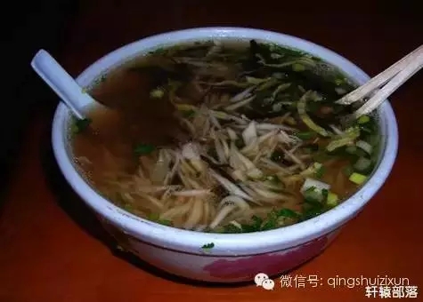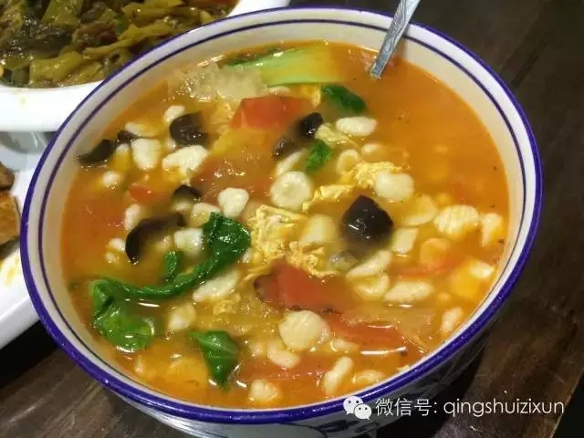 浆水拌汤是天水人日常生活中不可或缺的一道美味。浆水菜以苦曲、芹菜为最主,沸水烫过后,用特制酸水浸泡一天后即可。浆水拌汤是把葱花过油后,将浆水菜倒入,炝到微沸,倒入准备好的面粉小疙瘩,煮熟后舀出即可。浆水拌汤具有酸、辣、清香的口感,别具一格,入口回味无穷,有开胃健脾的功效,是天水人餐桌上最常见的汤品。