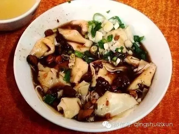 在地处天水市东北的清水县城,扁食作为当地居民早餐中最受青睐的小吃,其选料考究,烹饪过程复杂,入口滑爽,风味独特,在全国其他地方早餐中绝无仅有。清水扁食又因清水居民中回族等少数民族居住较多,具有浓郁的民族特色——有汉族的荤扁食和回族的素扁食两种。汉族荤扁食的烹制分炒、包、煮、调四个过程,炒指的是炒大肉(猪肉)臊子。取上好的五花肉,起一厘米薄厚的长条,一刀一刀切成肉丁,配以盐、醋、酱油、料酒等各种调料腌制片刻,再用慢火炒制,火候要掌握得不大不小,大则糊,小则无色;包扁食是先将机压或手擀的面切成大小合适的梯形面片(饭店中多是压面机压制的面片),放一沓面片在手掌上,抓少许韭菜末,一折、一挑、一弯、一捏,变魔术般包成了耳朵状的扁食;煮扁食也很讲究,要煮的恰到好处,一般滚过两水便可出锅;调指的是将盛在碗里的扁食浇上精心炒制的大肉臊子,放些许葱花,调上油泼辣子、醋、盐,一碗色、香、味俱佳的清水荤扁食便呈现在你的面前。与荤扁食相比,回族素扁食讲究清淡味鲜,其烹制是用芹菜、萝卜、豆腐、韭菜等为馅,捞在碗里配以豆芽、菠菜等,浇上一勺纯胡麻油,调上辣椒、醋、盐即可食用。清水县东部的山门、秦亭等乡镇盛产大麻,当地群众用麻籽仁和豆腐为馅所作的麻腐扁食尤为清水扁食中的珍品。“扁食"与“遍食"谐音,是人们寄希望生活更加美好,遍食天水美食之意,因此,逢年过节吃扁食已成为清水人民的传统美食。