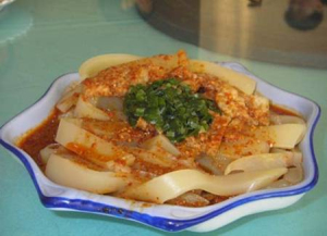 呱呱的吃法也比较独特,先将呱呱撕成小片,再配上辣子油、芝麻酱、芥末、酱油、食盐、食醋、蒜泥等调料即可。如果说西北人喜食酸辣,那么天水呱呱可是典型的辣味小吃。若初食者,面对满碗流红的呱呱,定会咋舌、冒汗。而当地人尤喜以呱呱为早点,一些男士几乎“不可一日无此君"。