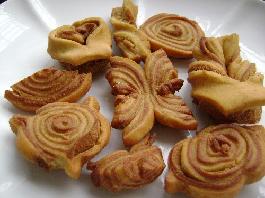 一般都用两种面团制成:一种叫做死面,就是只用水和成的面团;另一种是蜜发面,就是用酥面、蜂蜜和经过发酵的面一起揉成的面团。先将死面擀开,在上面平铺一层蜜发面,然后再卷成面卷,用刀横切成三四毫米厚的面片,加工成各种花卉和动物图案,最后放进油锅炸熟,即告成功。它的特点是死面洁白,发面焦黄,花样繁多,酥软甜美,既好看,又好吃,是逢年过节家家必备的食品。