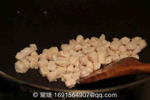8.放入滑好的鸡胸粒,继续翻炒,加一点点盐调味。