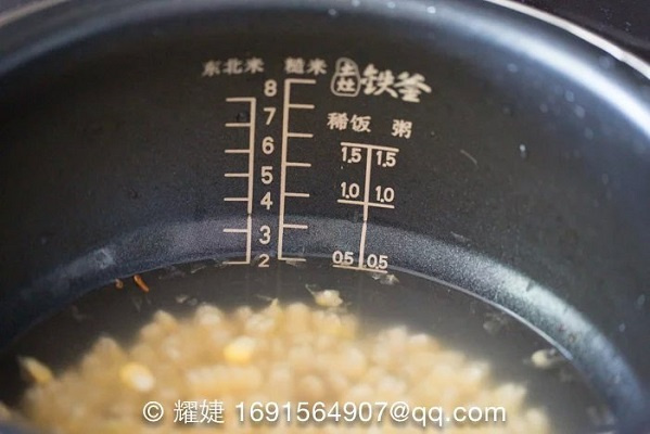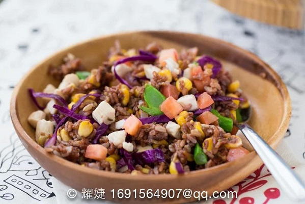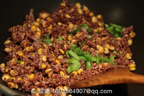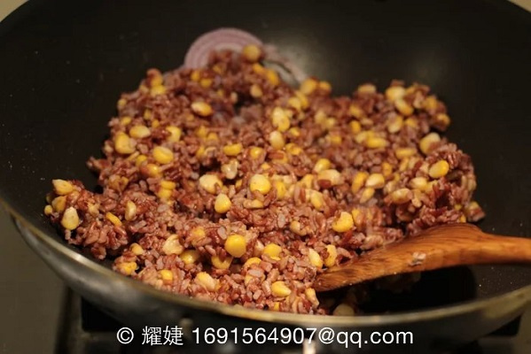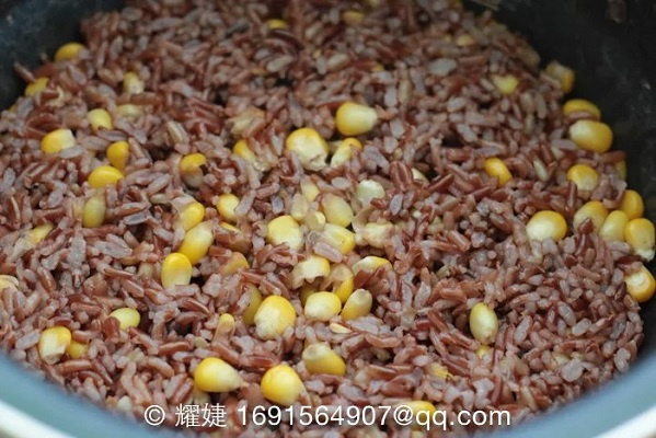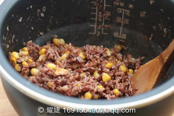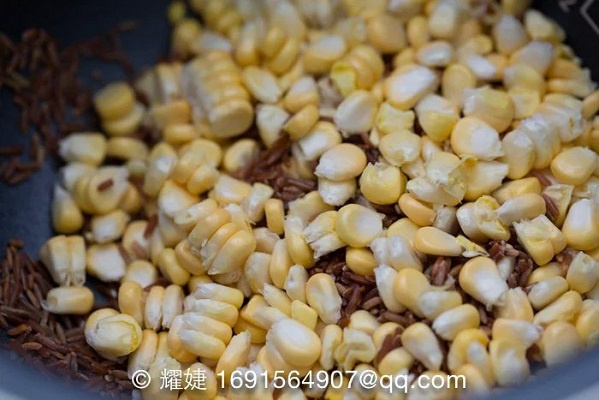 1.玉米洗净剥粒,与红米一起入电饭煲焖成米饭。焖好后翻散自然冷却。